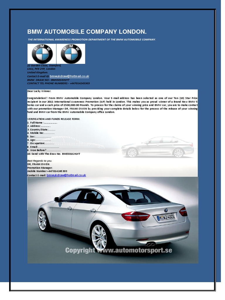 The Bmw Automobile Company Congratulate You As One Of Our Ten 10 Star Prize Caught In The Act. The bmw motors promotion is sponsored by united kingdom promo and other international companies. This is the official facebook page of bmw uk. Email from 'the international awareness promotion department of the bmw automobile company' you may have received an email claiming to be from bmw's. Calls are free of charge from all consumer landlines and mobile phones. Bmw automobile uk contact information and services description. Head office 10 cabot square london h146qr, england. Welcome to the official bmw uk facebook page, a page for enthusiasts, fans & drivers. Home phone & mobile number bmw automobile company uk. The bmw motors mobile draw is held to encourage you and others to play and promote mobile users. Contact the bmw team today and discover how call us on: Every aspect of everything bmw, at your fingertips. You have acquired/amount won £ 750, 000.00 from bmw. We will provide you with news, information and enterta. Calls are charged at the local rate, plus your phone company's. Inspiring stories and interviews, exciting videos and helpful insight.